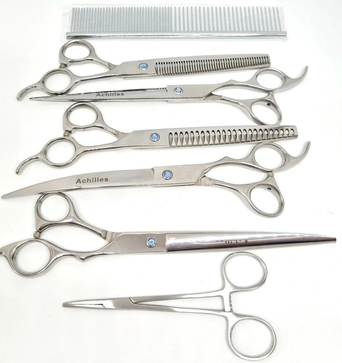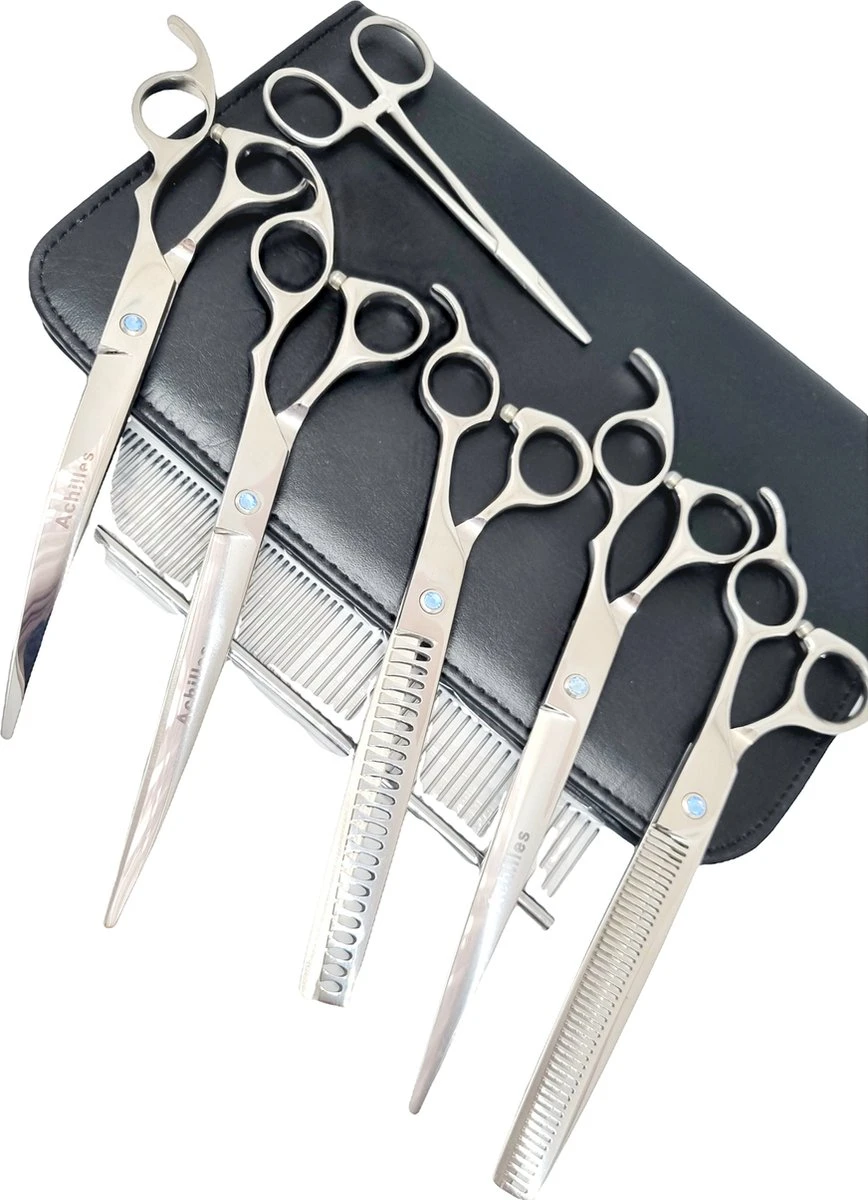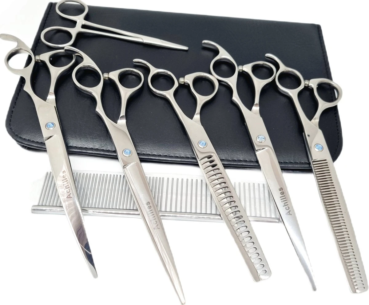 Zijn de haren van uw hond te lang? Wil je je huisdier zelf verzorgen? Dan is de 8-delige scharenset van Achilles de juiste voor u.