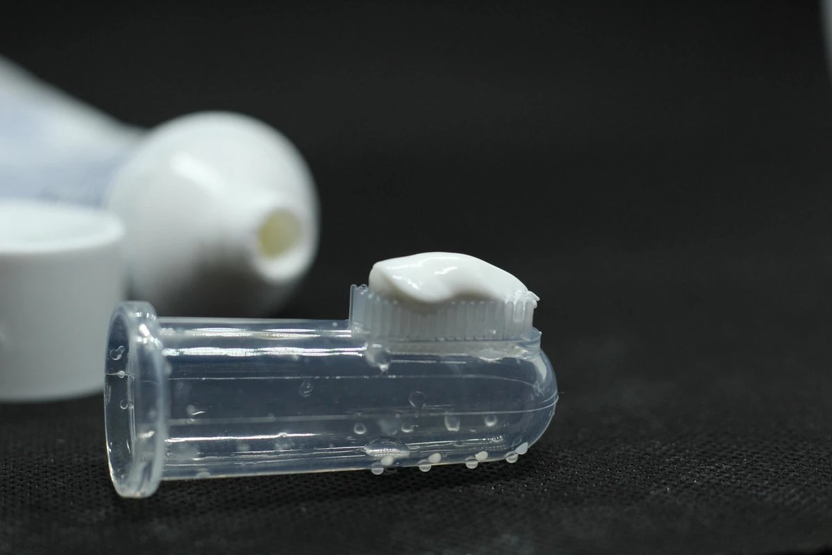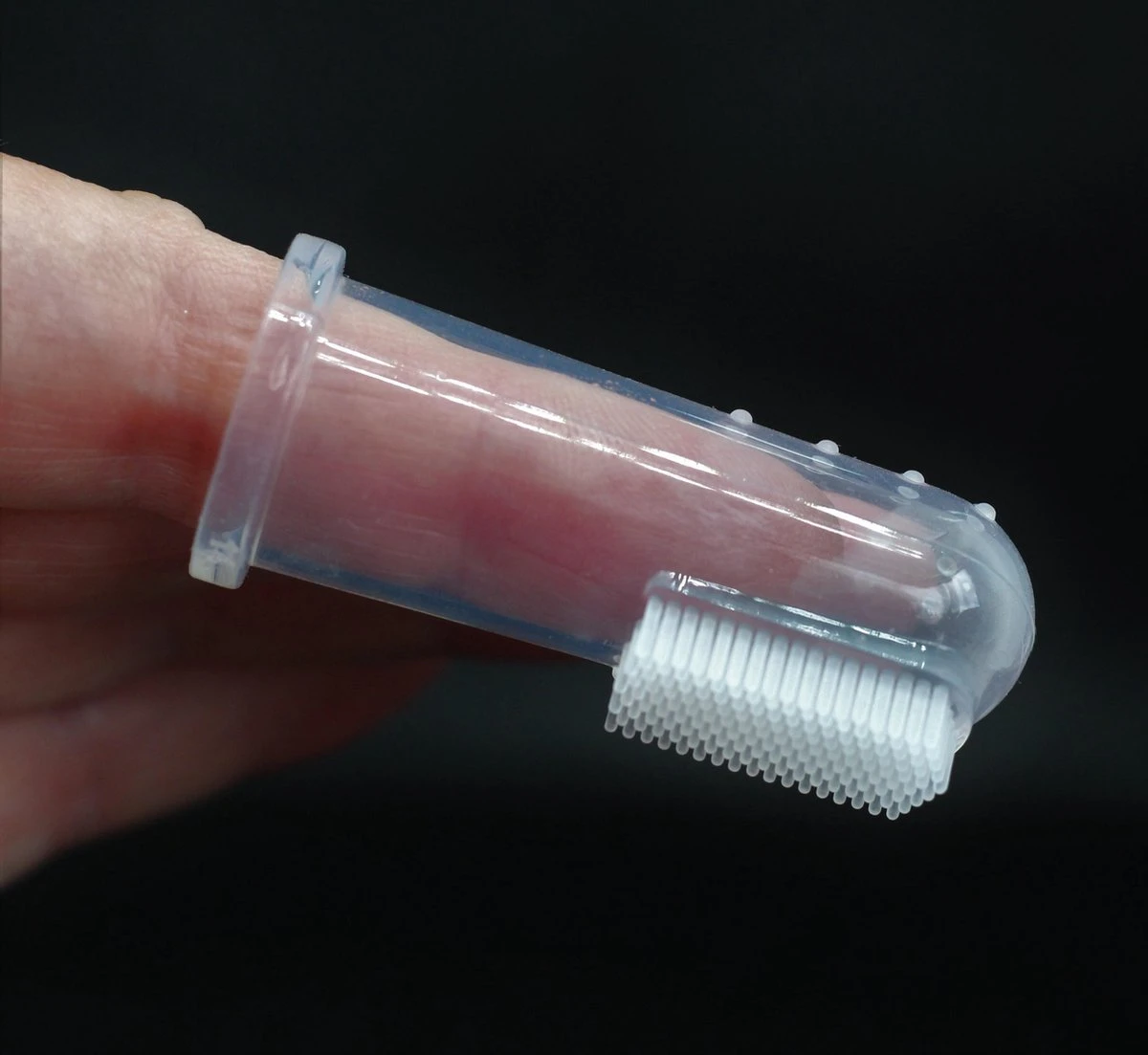 - Schuif de tandenborstel over de wijsvinger, dit werkt vaak het makkelijkst