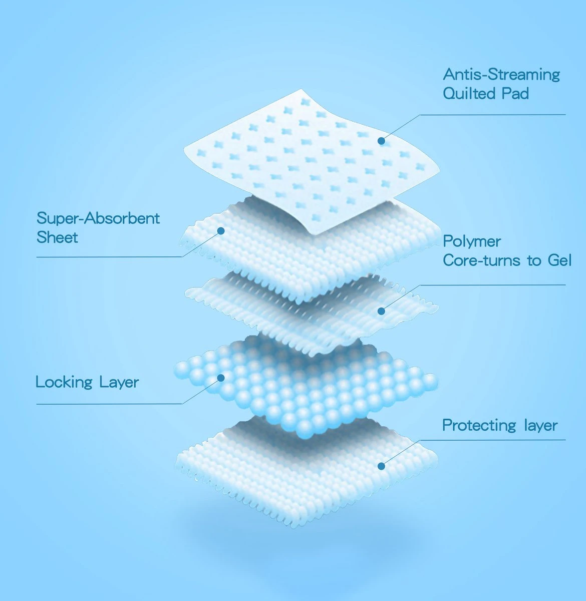 De pads hebben geavanceerde antibacteriële polymeertechnologie om snelle vloeistofabsorptie en snelle droging te garanderen. Deze pads absorberen tot 4 kopjes vloeistof en blokkeren effectief vocht in de gel om lekken te voorkomen.