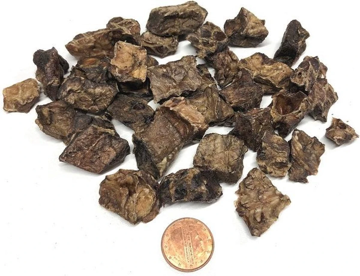 Gedroogde Runderlong stukjes 100% Rund. Deze kleine stukjes long is zeer geschikt voor gebruik als een gezonde trainer. Mager, vetvrij rundvlees. Geschikt voor alle rassen. Ideaal voor gevoelige of honden met overgewicht. Ook geschikt voor de oudere hond en natuurlijk voor de pup. Deze natuurlijke kauwsnack van 100% Runderlong zonder toevoegingen. Herkomst Rund / EU